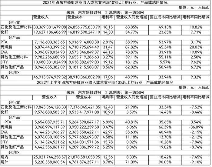 截止2022年9月,东方盛虹的主要产能包括:PTA390万吨(连云港虹港石化),化纤260万吨(宿迁国望高科,包括30万吨再生纤维),1600万吨炼油、280万吨PX、110万吨乙烯(连云港盛虹石化)70万吨PDH、30万吨EVA、78万吨丙烯腈、17万吨/年MMA、20万吨/年EO(连云港斯尔邦)。