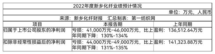 第一纺织网据财报获悉,2022年前三季度,新乡化纤实现营业收入57.21亿元,同比下降11.8%;实现归属于上市公司股东的净利润亏损2.93亿元,上年同期为12.9亿元,未能维持盈利状态。公司预计,2022年实现归属于上市公司股东的净利润亏损4.1亿元至4.6亿元,同比盈转亏;扣非净利润亏损4.4亿元至4.9亿元,同比盈转亏。