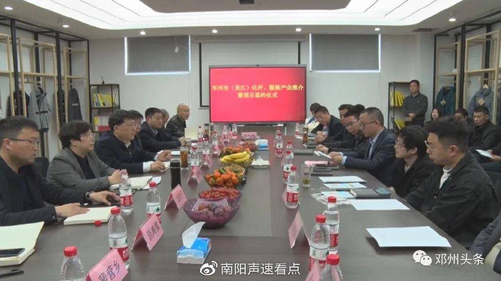 3月2日,邓州市(吴江)化纤服装产业推介暨项目签约仪式在苏州市吴江区举行,邓州市领导黄登科、李景龙,孟楼综合改革发展示范区党工委书记、管委会主任、孟楼镇党委书记李征,开发区党工委书记、管委会主任赵明辉以及苏州富思曼有限公司、首尔世明纺织、知美控股集团等20余家企业负责人出席签约仪式。