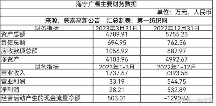广东蒙泰高新纤维股份有限公司(以下简称“蒙泰高新”)日前发布公告称,为增强公司BCF产品的研发实力,进一步加强对江浙市场乃至长三角市场客户的维护和拓展,开拓属地供应能力,优化公司业务结构,扩展业务规模,公司以现金方式收购海宁海泰新材料科技有限公司、杨建蔚、黄莜卉、孙耀东合计持有的海宁广源51%股权,其中拟收购海宁海泰新材料科技有限公司持有的海宁广源23.53%股权,拟收购杨建蔚持有的海宁广源20.41%股权,拟收购黄莜卉持有的海宁广源3.53%股权,拟收购孙耀东持有的海宁广源3.53%股权。